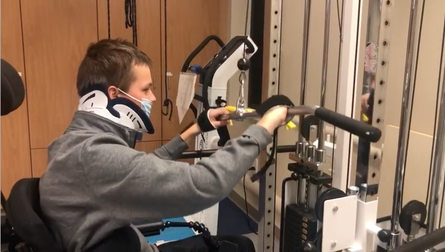 We wandered down to the therapy gym to find a variety of equipment to experiment with. He was very encouraged to begin to challenge himself. He rolled up to one familiar pulley weight set that he had used prior to the accident, only to realize he would have no grip in his fingers to hold the bar. No problem. We got creative and velcroed his hands to the bar in order for him to pull down on it. We felt pretty proud of ourselves.